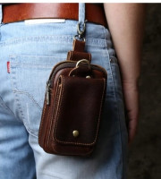 Genuine Leather Men's Waist Bag Top Layer Cowhide Fashion Hook Bag Leisure Belt Bag Cigarette Box 6.5-inch Mobile Phone Bag Brown